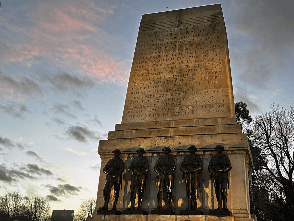 My walk back carried me along the east boundary of St. James’s Park past the Horse Guards Parade and where I caught what I thought was a beautiful sky behind the Guards Memorial.