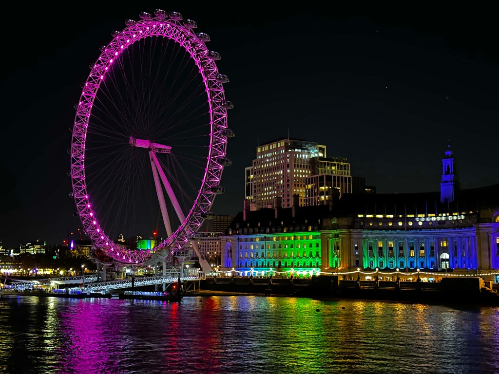 The London Eye at night viewed from Westminster Bridge